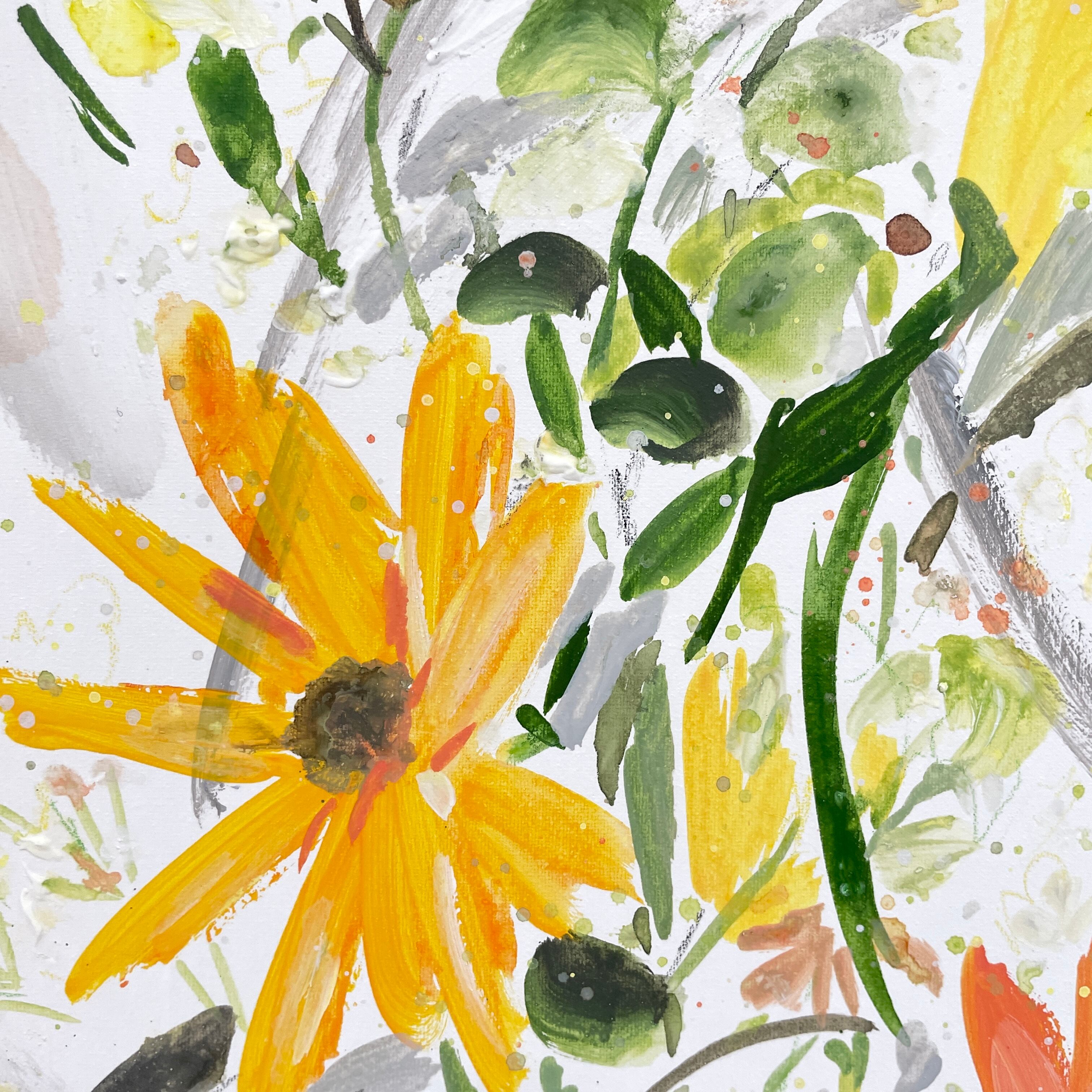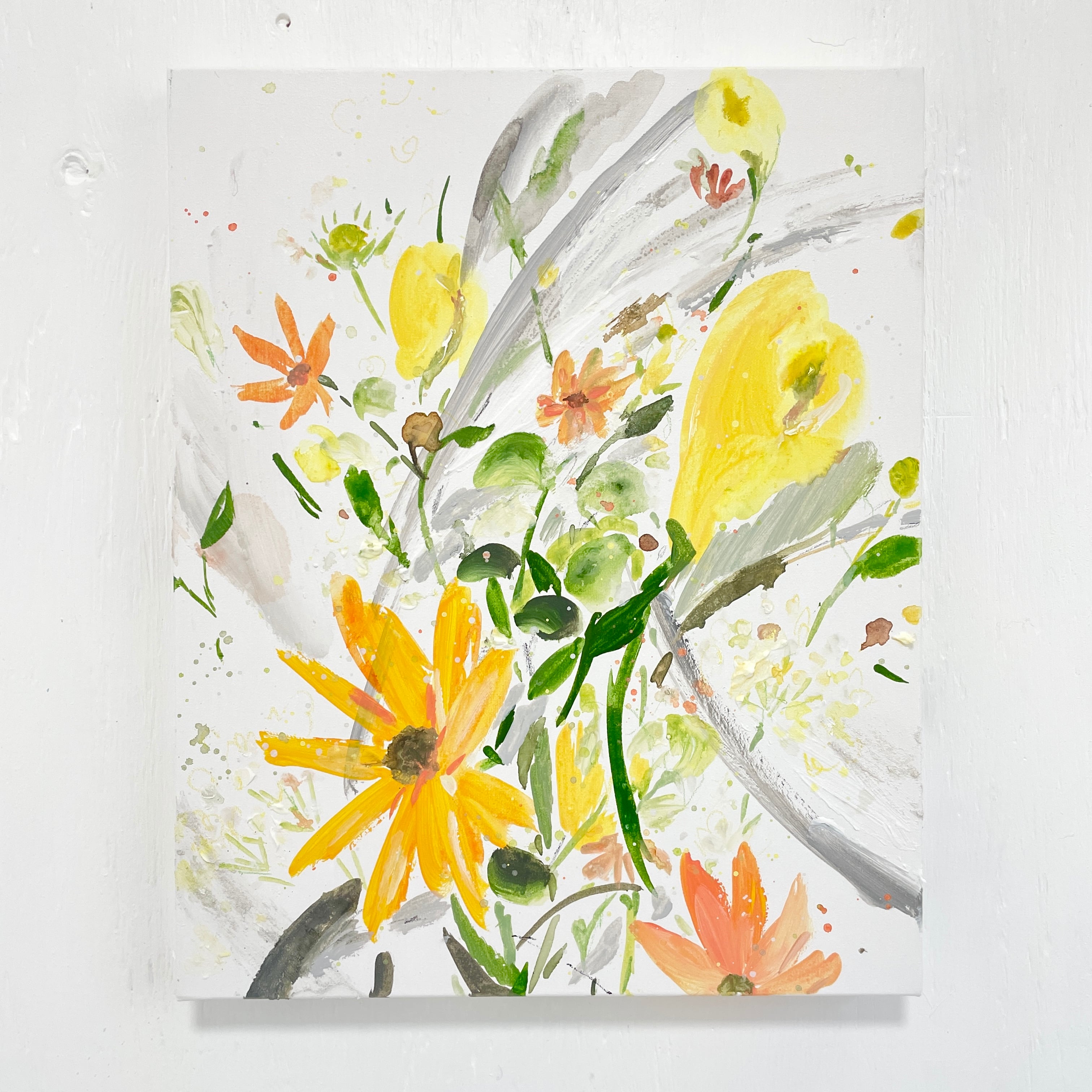 歌い出したり、踊り出したいような気持ちを、絵の具とお花に託して表現しています。