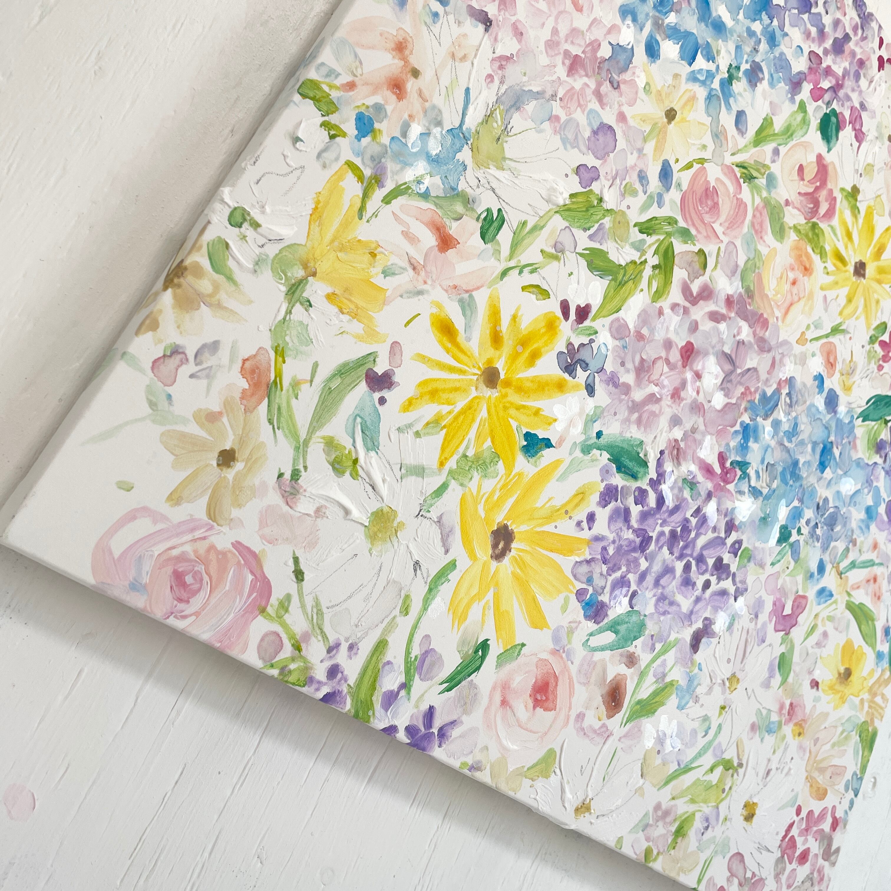 歌い出したり、踊り出したいような気持ちを、絵の具とお花に託して表現しています。